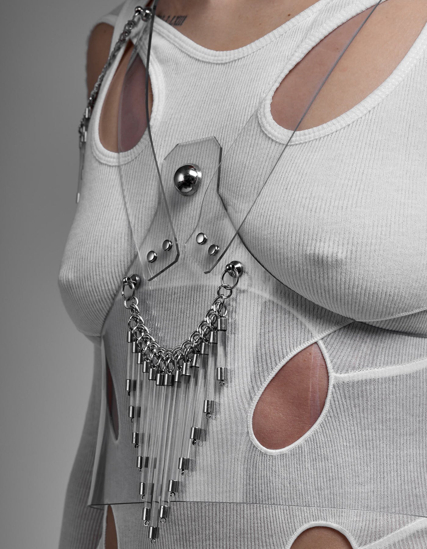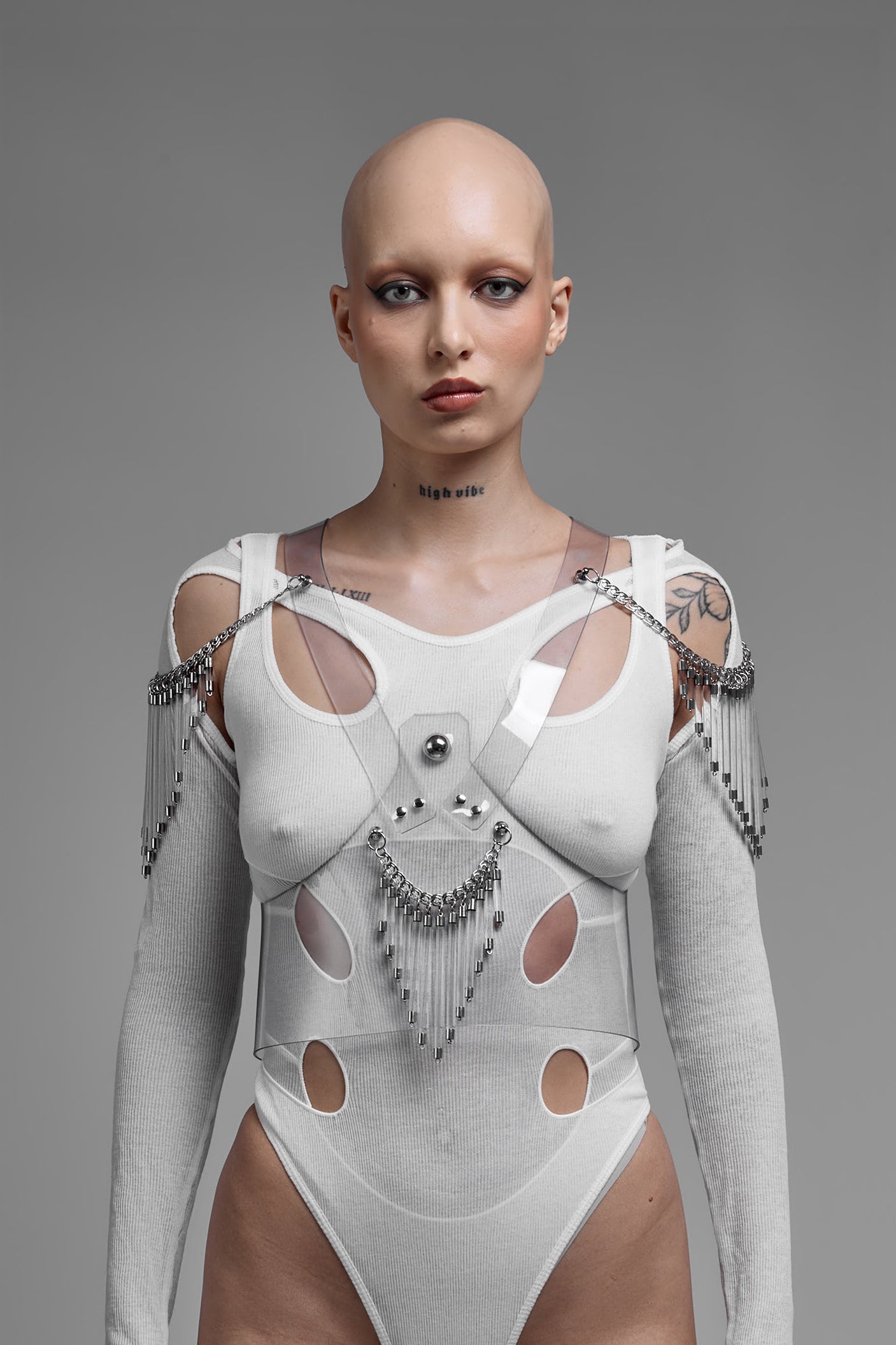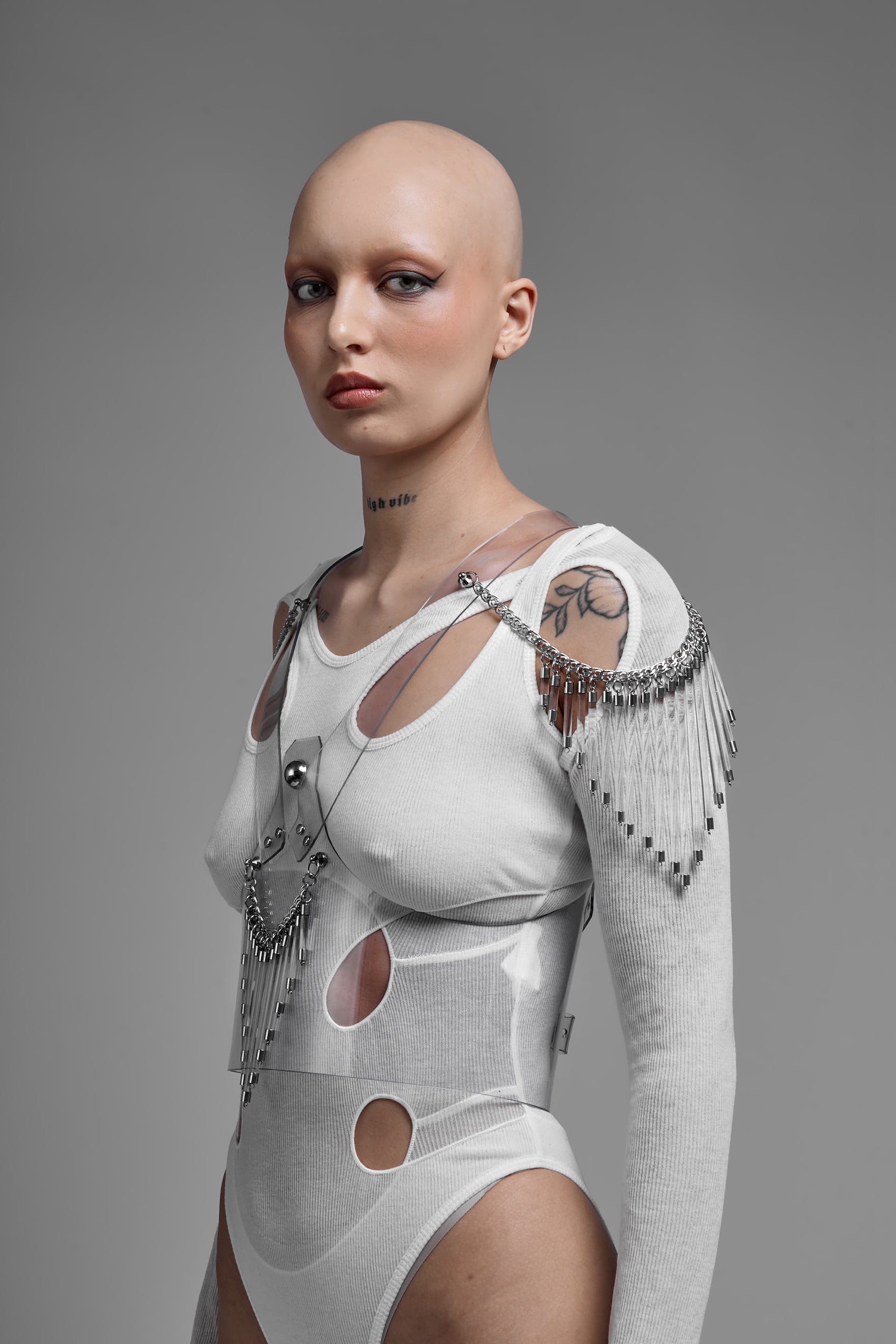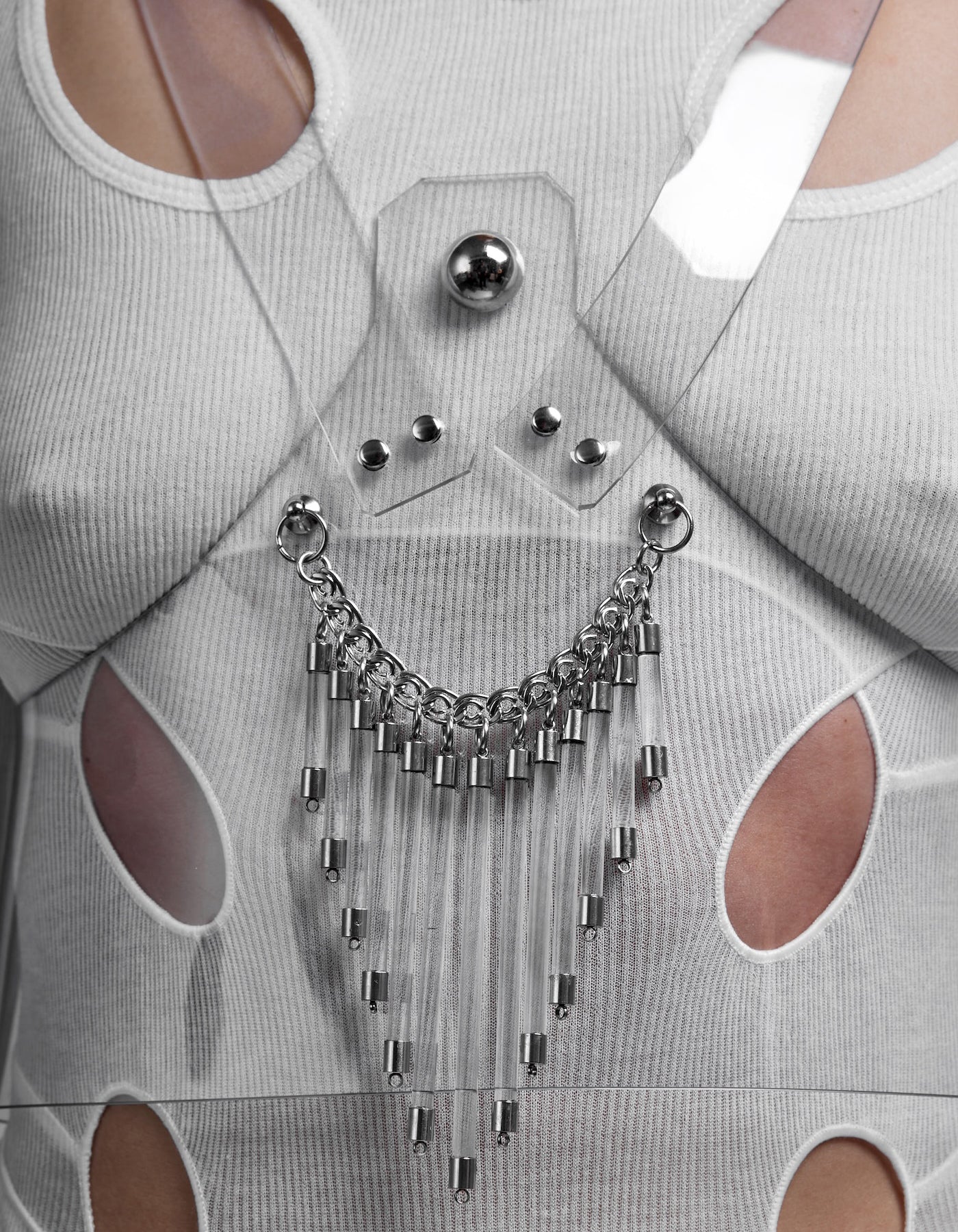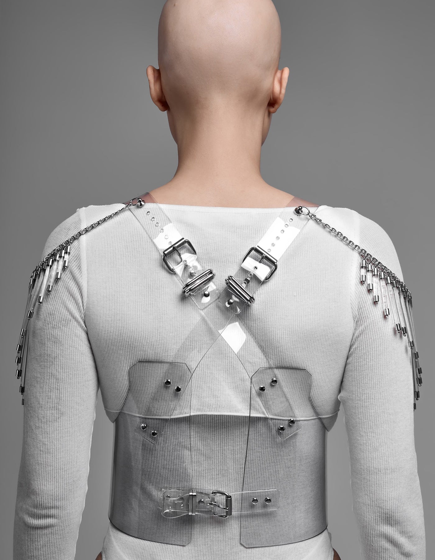The Galactic Corset is defined by structure and transparency. Crafted from clear, recyclable, skin-friendly PVC, it reveals the body while maintaining a precise, architectural silhouette. Acrylic bars introduce a linear framework, creating a controlled tension between flexibility and structure. The interplay between transparency and rigid elements forms a dynamic composition of light, form, and space. Minimal in material, yet complex in construction. Designed in Berlin, Galactic reflects a refined approach to futurism, sustainability, and sculptural bodywear.